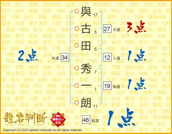 與(17画)古(5画)田(5画) 秀(7画)一(1画)朗(11画)