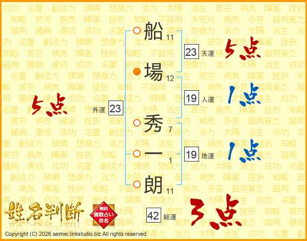 船(11画)場(12画) 秀(7画)一(1画)朗(11画)