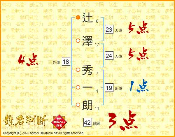 辻(6画)澤(17画) 秀(7画)一(1画)朗(11画)
