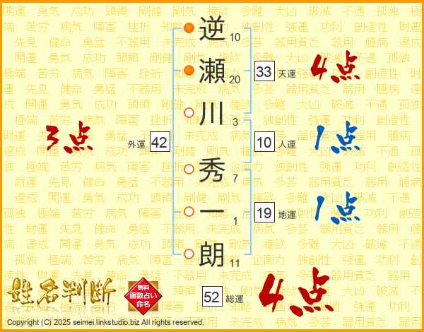 逆瀬川秀一朗さんの総運は52画の4点!