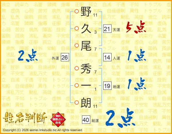 野(11画)久(3画)尾(7画) 秀(7画)一(1画)朗(11画)
