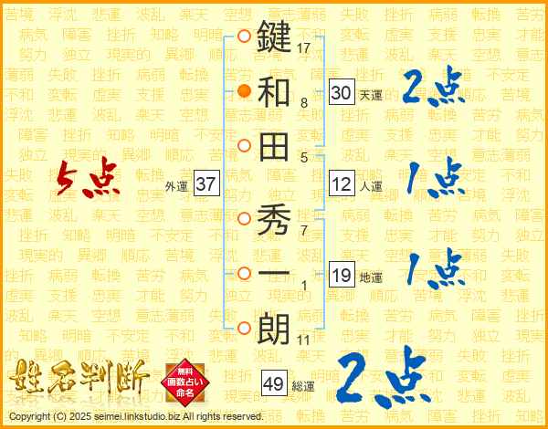 鍵(17画)和(8画)田(5画) 秀(7画)一(1画)朗(11画)