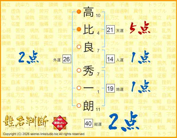 高(10画)比(4画)良(7画) 秀(7画)一(1画)朗(11画)
