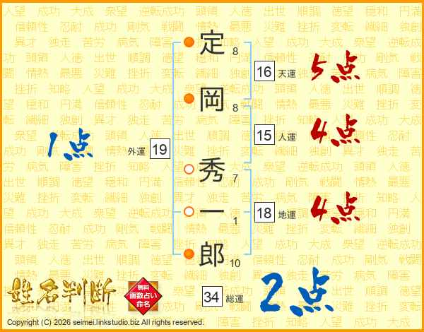 定(8画)岡(8画) 秀(7画)一(1画)郎(10画)