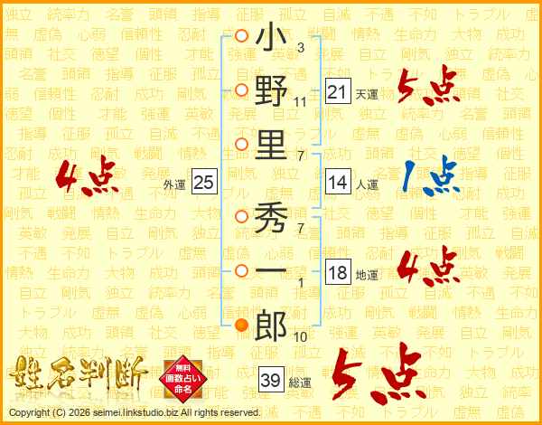 小野里秀一郎さんの総運は39画の5点!