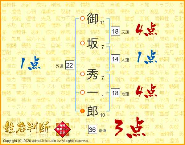御(11画)坂(7画) 秀(7画)一(1画)郎(10画)