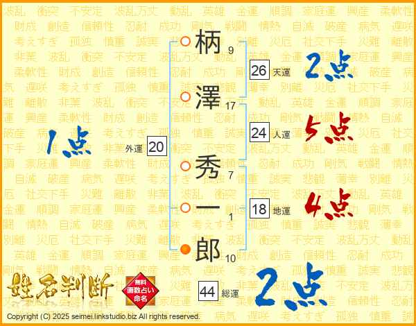 柄(9画)澤(17画) 秀(7画)一(1画)郎(10画)