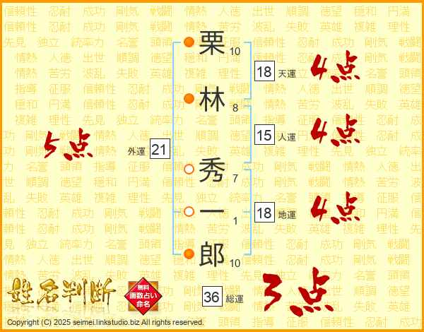 栗(10画)林(8画) 秀(7画)一(1画)郎(10画)