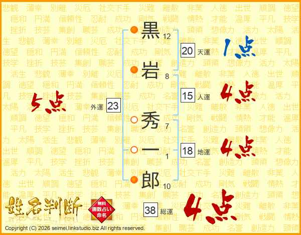 黒(12画)岩(8画) 秀(7画)一(1画)郎(10画)