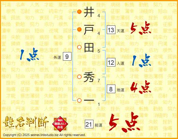 井(4画)戸(4画)田(5画) 秀(7画)一(1画)