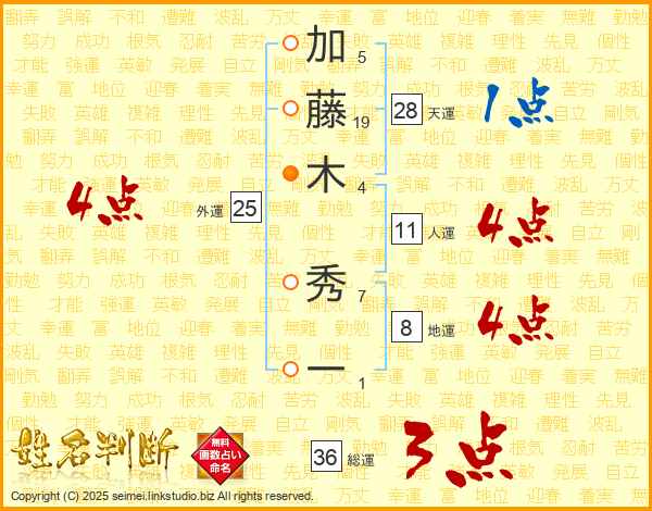 加(5画)藤(19画)木(4画) 秀(7画)一(1画)