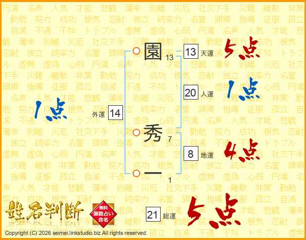 生活面を象徴する運勢です。外部から受ける影響力を表し、結婚運、家庭運や職場、環境への順応性を表します。総運から人運を引いた画数。姓や名が1文字の場合を除く。