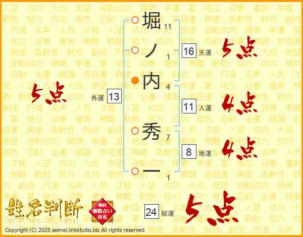 堀ノ内秀一さんの総運は24画の5点!