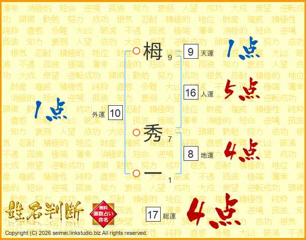 生活面を象徴する運勢です。外部から受ける影響力を表し、結婚運、家庭運や職場、環境への順応性を表します。総運から人運を引いた画数。姓や名が1文字の場合を除く。