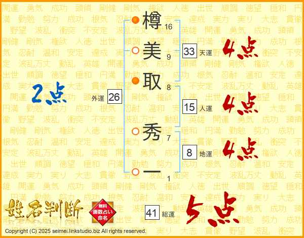 樽(16画)美(9画)取(8画) 秀(7画)一(1画)