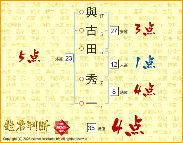 與(17画)古(5画)田(5画) 秀(7画)一(1画)
