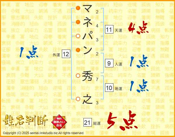 マ(2画)ネ(4画)パ(3画)ン(2画) 秀(7画)之(3画)