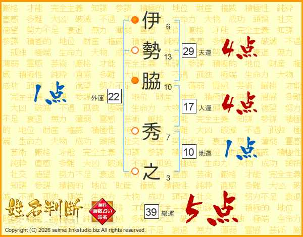 伊勢脇秀之さんの総運は39画の5点!