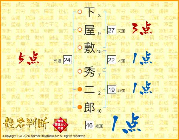 下(3画)屋(9画)敷(15画) 秀(7画)二(2画)郎(10画)