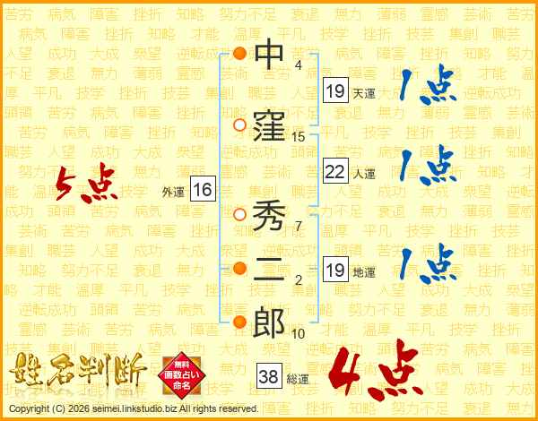 中窪秀二郎さんの総運は38画の4点!