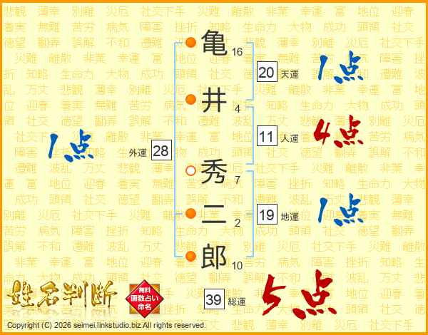 亀井秀二郎さんの総運は39画の5点!