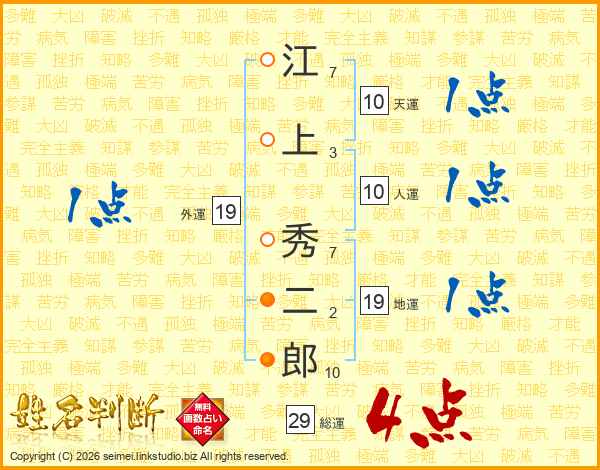 江(7画)上(3画) 秀(7画)二(2画)郎(10画)