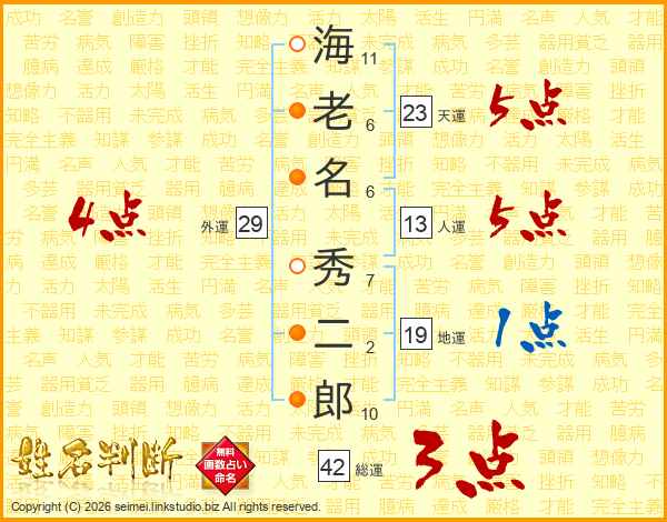 海(11画)老(6画)名(6画) 秀(7画)二(2画)郎(10画)