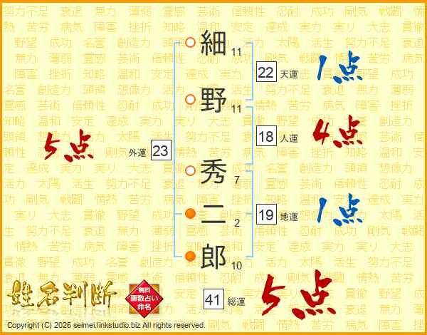 細(11画)野(11画) 秀(7画)二(2画)郎(10画)