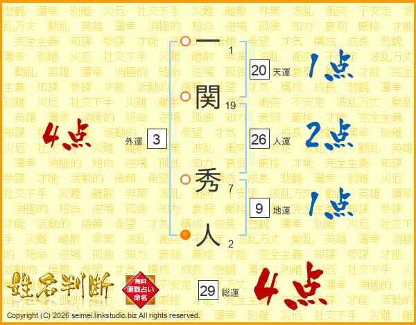 生活面を象徴する運勢です。外部から受ける影響力を表し、結婚運、家庭運や職場、環境への順応性を表します。総運から人運を引いた画数。姓や名が1文字の場合を除く。