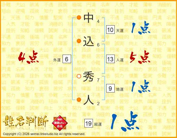 生活面を象徴する運勢です。外部から受ける影響力を表し、結婚運、家庭運や職場、環境への順応性を表します。総運から人運を引いた画数。姓や名が1文字の場合を除く。