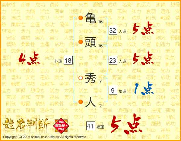 亀(16画)頭(16画) 秀(7画)人(2画)