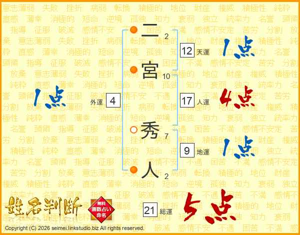 生活面を象徴する運勢です。外部から受ける影響力を表し、結婚運、家庭運や職場、環境への順応性を表します。総運から人運を引いた画数。姓や名が1文字の場合を除く。