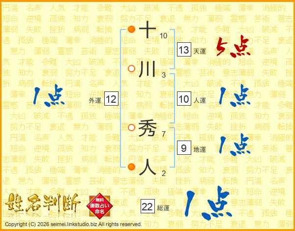 生活面を象徴する運勢です。外部から受ける影響力を表し、結婚運、家庭運や職場、環境への順応性を表します。総運から人運を引いた画数。姓や名が1文字の場合を除く。