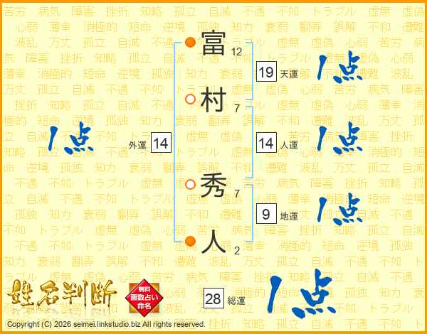 生活面を象徴する運勢です。外部から受ける影響力を表し、結婚運、家庭運や職場、環境への順応性を表します。総運から人運を引いた画数。姓や名が1文字の場合を除く。