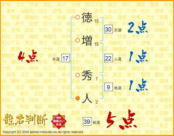 徳増秀人さんの総運は39画の5点!