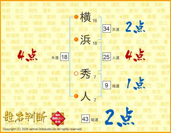 横浜秀人さんの総運は43画の2点!