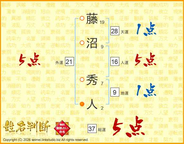 藤沼秀人さんの総運は37画の5点!