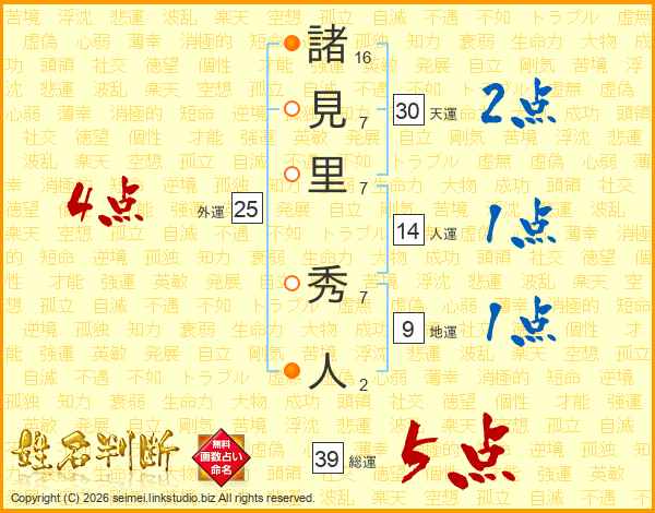 諸(16画)見(7画)里(7画) 秀(7画)人(2画)