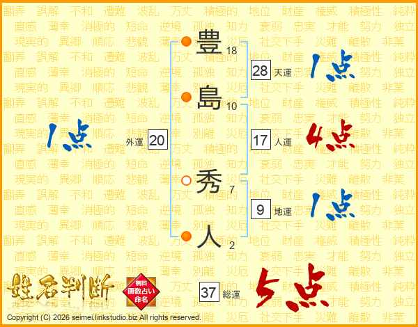 生活面を象徴する運勢です。外部から受ける影響力を表し、結婚運、家庭運や職場、環境への順応性を表します。総運から人運を引いた画数。姓や名が1文字の場合を除く。