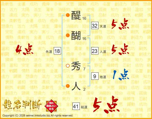 醍(16画)醐(16画) 秀(7画)人(2画)