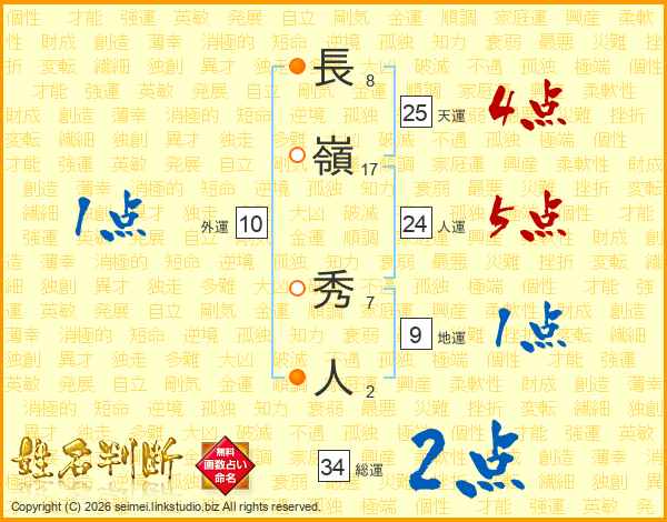 長(8画)嶺(17画) 秀(7画)人(2画)
