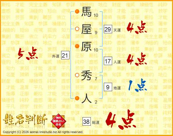馬(10画)屋(9画)原(10画) 秀(7画)人(2画)