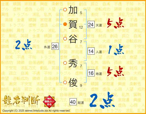 加(5画)賀(12画)谷(7画) 秀(7画)俊(9画)