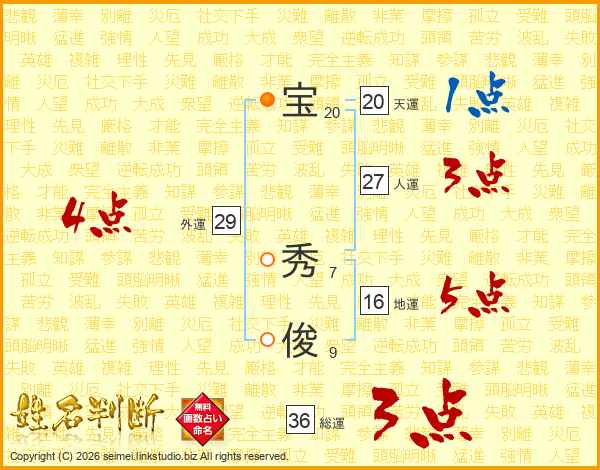 宝秀俊さんの総運は36画の3点!