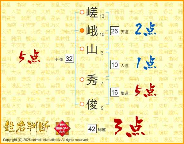 嵯(13画)峨(10画)山(3画) 秀(7画)俊(9画)