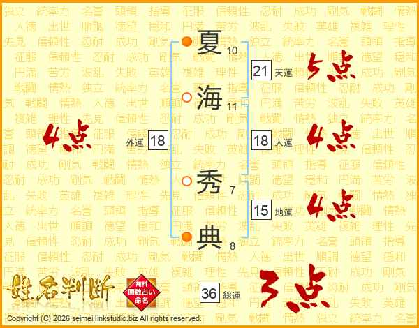 夏(10画)海(11画) 秀(7画)典(8画)