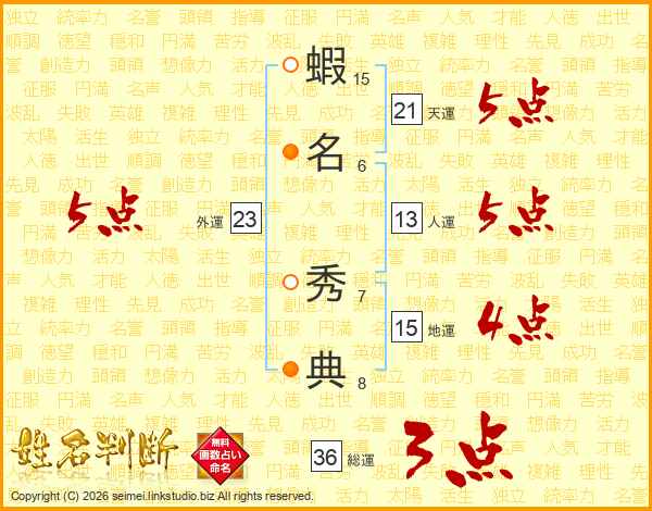 蝦(15画)名(6画) 秀(7画)典(8画)