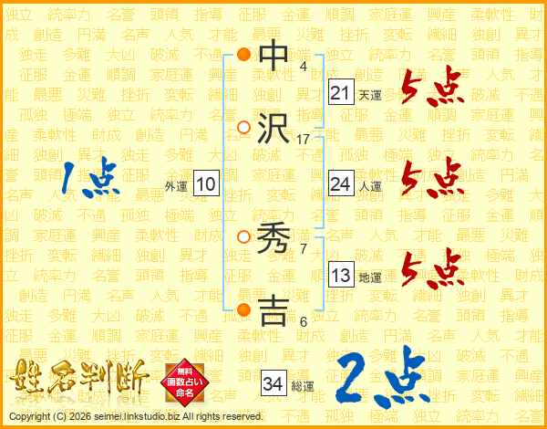 中沢秀吉さんの総運は34画の2点!