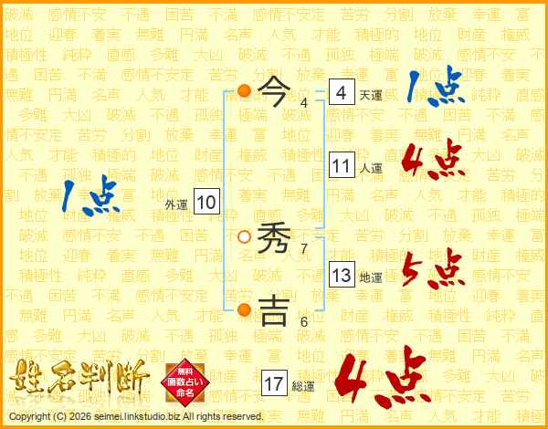 生活面を象徴する運勢です。外部から受ける影響力を表し、結婚運、家庭運や職場、環境への順応性を表します。総運から人運を引いた画数。姓や名が1文字の場合を除く。
