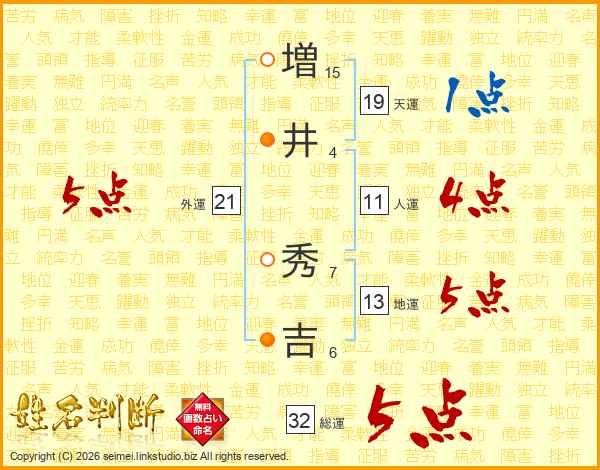 増(15画)井(4画) 秀(7画)吉(6画)